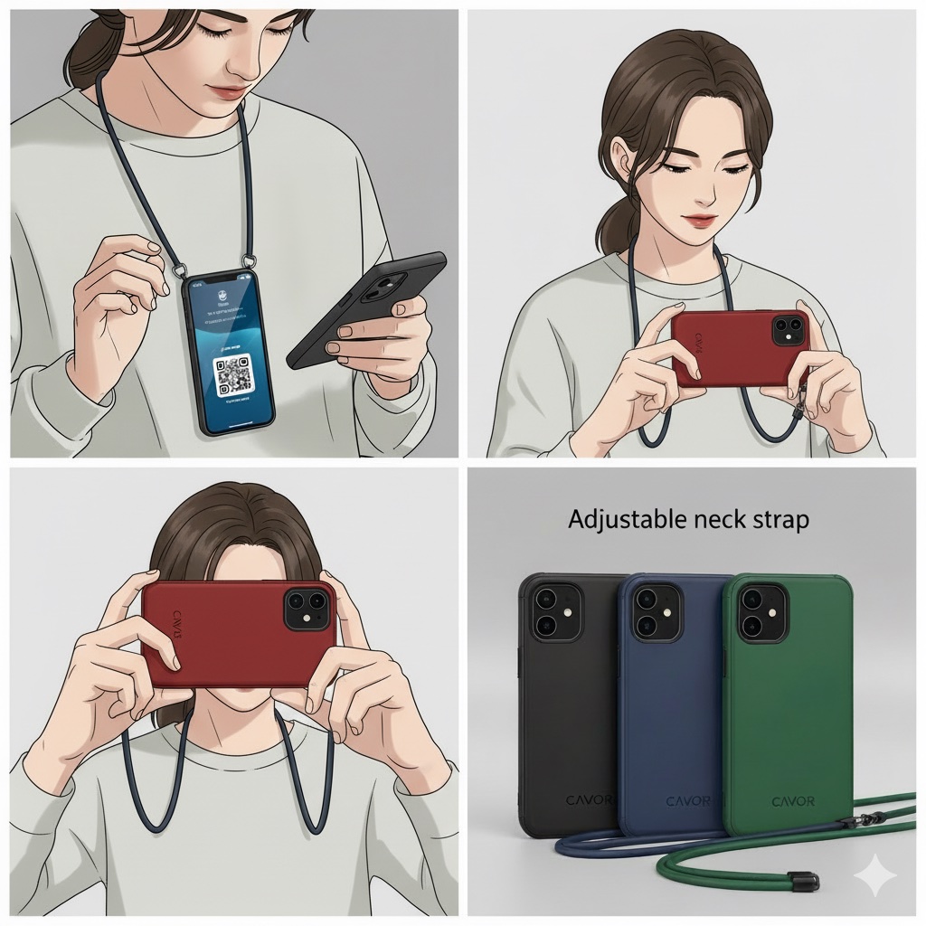 愛用しているのは、**Cavor(カーヴァー)**というメーカーのケース。このタイプは、スマホを縦にも横にも首からかけられるだけでなく、カードが4枚も入るポケットが付いているのが大きなポイントです。私の場合は、運転免許証、ETCカード、デビットカードの3枚を入れています。これだけで出かけられます(手ぶら最高です!)。写真を撮りたいときは、さっと横向きにすればカメラとしても使いやすいです。